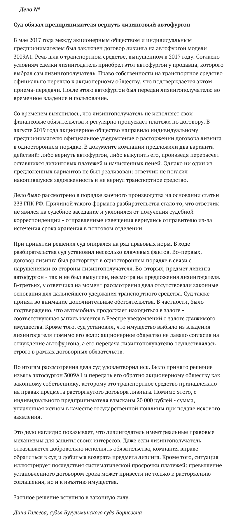 В новом номере газеты "Суд да Дело в Татарстане" опубликована статья «Суд обязал предпринимателя вернуть лизинговый автофургон». С 2025 года газета выходит 1 раз в месяц и только в электронном виде.![]() |
